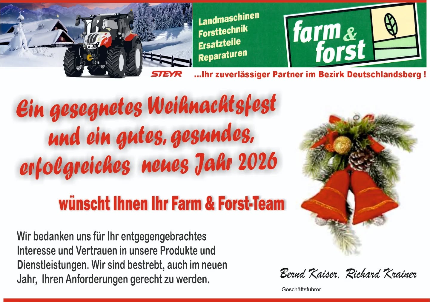 Ganz gleich, welcher Traktor, welche Land- oder Forstmaschine, welche Wartung oder welche Reparatur ansteht: Jeder Kunde wird bei Farm & Forst schnell, professionell und kompetent betreut. Selbstverständlich werden auch §57-Überprüfungen, Auf- und Umbauten